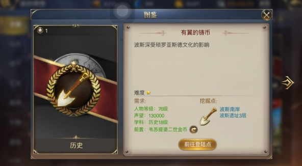 要求人物等级76级,声望130000,历史18级,前置发现物“韦苏提婆二世金币”。