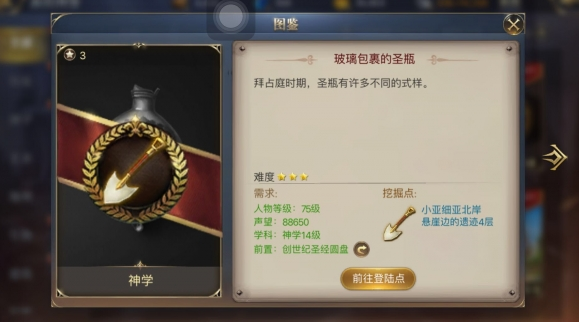 要求人物等级75级,声望88650,神学14级,前置发现物“创世纪圣经圆盘”。