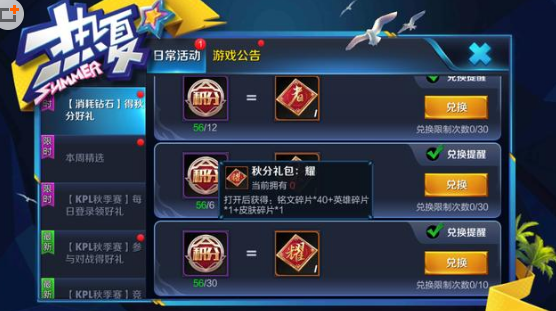 耀(180积分=6个):240铭文碎片+6英雄碎片+5皮肤碎片