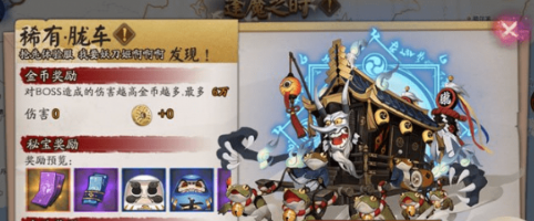 各位阴阳师大人进行现世逢魔之时有几率发现胧车BOSS,击败即有几率获得紫符、蓝符、白蛋、蓝蛋和大量金币等奖励