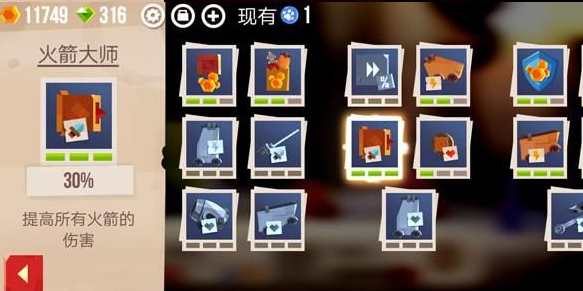 技能点:每升一段给一点,满级也点不满技能,所以慎重。优先点通用性和强力性的技能,通用性的,跳过减金币、出售加金币、开箱加金币、防御加金币、增加一场赌局,赌局加成提升(后面等你能看到的你就会了)。强力性的,火箭加攻击、双管火箭加攻击、攻击包提升、血包提升、圆锯加攻击(剩下的24段再看)。