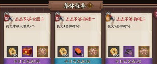 ①寮府每日会向全部阴阳寮发布集体任务;第一、二任务栏要求是固定的,第三个可有会长/副会长在12:00前自动选择,过期就变成固定了。(任务每天更新)