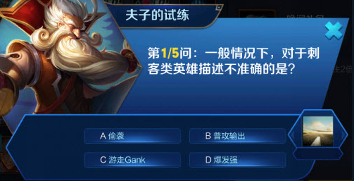 首页 → 安卓游戏资讯 → 安卓游戏攻略 → 一般情况下对于刺客类英雄描述不准确的是 王者荣耀夫子的试练答题答案