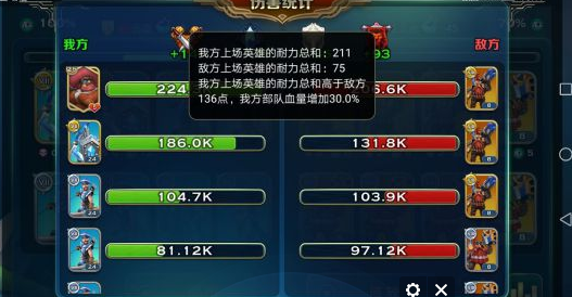 上场所有英雄任一属性总和若高于对方,己方部队将获得30%的属性加成,其中武力对应部队武力攻击,魔力对应魔法攻击,统御对应攻击速度,耐力对应血量,对英雄数量,属性和装备是考验,这是打高于己方1-2级部队的关键。后期PK双方为争取这30%的部队加成必定上齐所有英雄,这很好解释了一个英雄卖648的原因,也是氪金党和平民党的的主要实力差距.