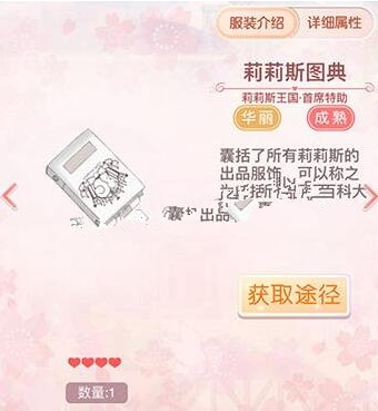 这本只有在幻之阁才能抽到的限定品,在游戏前期可是难倒了不少玩家。许多人用设计图辛辛苦苦制作完成了首席特助的其他部件,却发现只剩这一个需要花费运气才能获得,不知道会不会很郁闷呢?不过好在只要坚持用免费次数在幻之阁内抽取,这本莉莉斯服装大百科的获得几率还是很高的!
