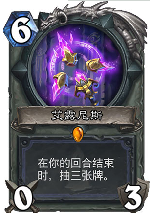 炉石传说狗头人与地下世界法师新卡,传说武器——艾露尼斯。6费,攻击/耐久:0/3,在你的回合结束时,抽三张牌。