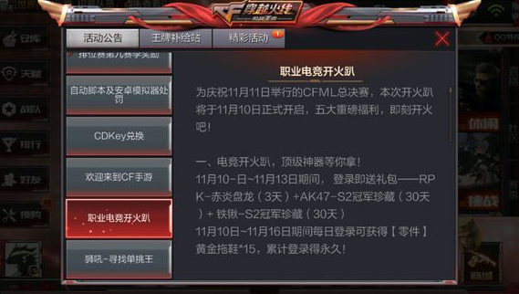 CF手游职业电竞开火趴活动有哪些,职业电竞开火趴活动一览。CF手游在11月10日要开启职业电竞开火趴活动,活动为玩家准备了五大福利哦,不少玩家都很期待,下面西西小编为大家带来职业电竞开火趴活动一览。