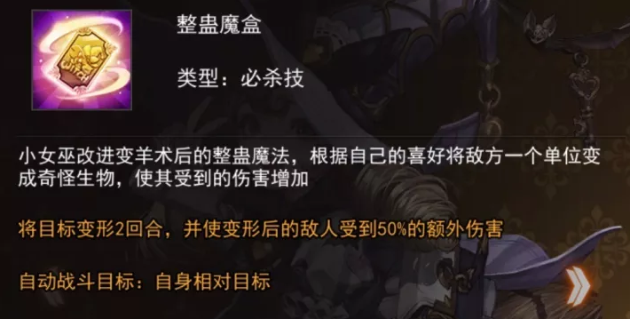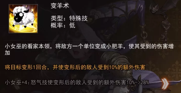 被动概率性的一回合变羊。因此她在各个领域都非常至关重要,比如对面就剩下了1个满血群体输出,或者说副本打单体BOSS关卡,带上她就意味着,稳过。所以前期请认准这个萌萌的小萝莉。