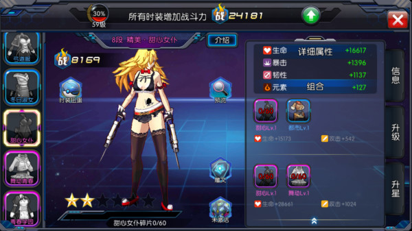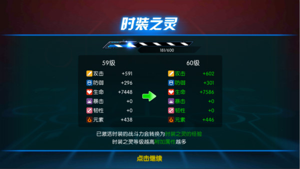 升级:时装自身属性各不相同,升级缓慢提升对应属性,每5级有一个额外属性,具体属性游戏中查看。