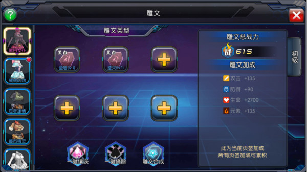 38级后即可开启时装雕文系统,每个时装有6个雕文槽,镶嵌后根据雕文等级以及属性,对应的增加时装基础属性。例如雕文商店中可以购买各种中级以下的雕文,有限的原石,尽量购买系统推荐的雕文。