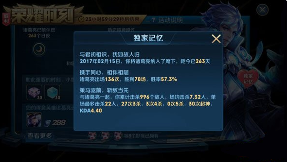 2.活动期间,从第一次弹出开始,每24小时,只会弹出一次荣耀时刻界面,同时,每个英雄也只能参与一次活动,敬请留意哦;