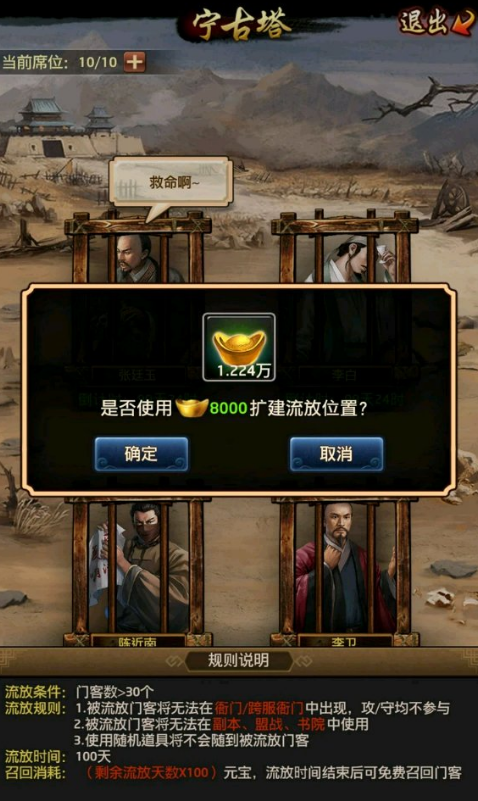 召回消耗:(剩余流放天数X100)元宝,流放时间结束可免费召回