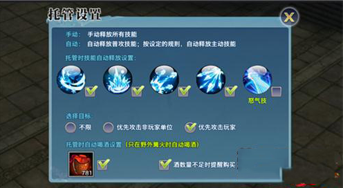 自动托管模式,可以让少侠释放双手,减少游戏疲劳和精力,不需要少侠亲自手动操作,遇到目标会自动攻击,释放技能。在托管界面可以设定释放技能。4个主动技能中,按自己的需求设定技能顺序和哪些技能需要自动释放。