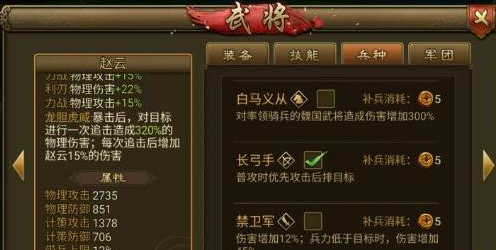 赵云这个武将的用法在一觉醒和二觉醒的情况下。赵云的输出很难秒杀别人所以说建议,如果说你是一觉醒或者二觉醒的话,你直接用禁卫军增加你的攻击力。这样的话可以秒杀前排防御力不是多强的武将。而3觉醒4觉醒建议使用长弓,因为我们都喜欢把输出放在后排。点杀死后排一个远比杀死前排所带来的优势明显。
