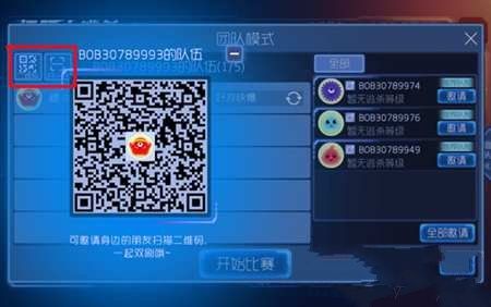 在团队模式邀请好友界面的左上角有一个“二维码”和一个“扫描”的图标,点击二维码就会出现我们队伍的二维码,如果身边有好友,