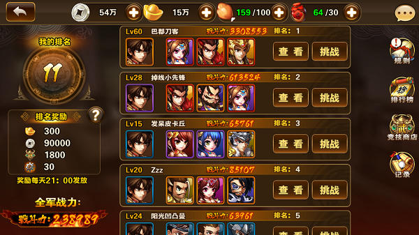 竞技场系统是玩家之间互相PK,展现实力的地方,在这里可以自由挑战排名靠前的玩家。