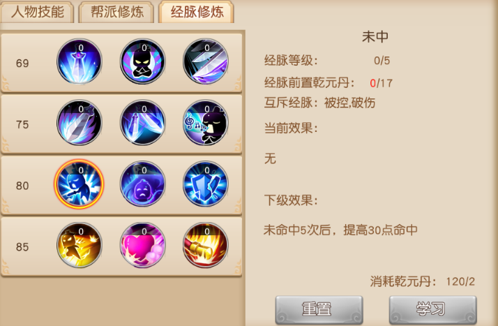 各位少侠将分别在等级达到69级、75级、80级、85级时解锁一层经脉,消耗乾元丹进行修炼,每个经脉的等级上限均为5级。需要注意的是,第三、第四层的经脉为互斥经脉,即每层只能选择一个经脉进行修炼,各位少侠需要根据自身搭配进行选择。如果各位少侠想要重新选择经脉进行修炼,进行重置经脉即可。