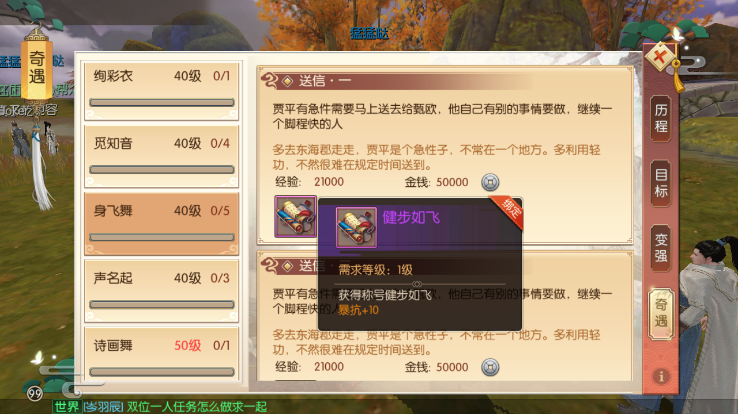 琅琊榜风起长林手游奇遇送信一怎么做,健步如飞奇遇完成攻略。不少玩家都在做送信一奇遇,玩家需要找到贾平帮其送东西,需要玩家在规定时间内送到,下面西西小编为大家带来琅琊榜风起长林手游奇遇送信一怎么做,西西小编为大家带来健步如飞奇遇完成攻略。