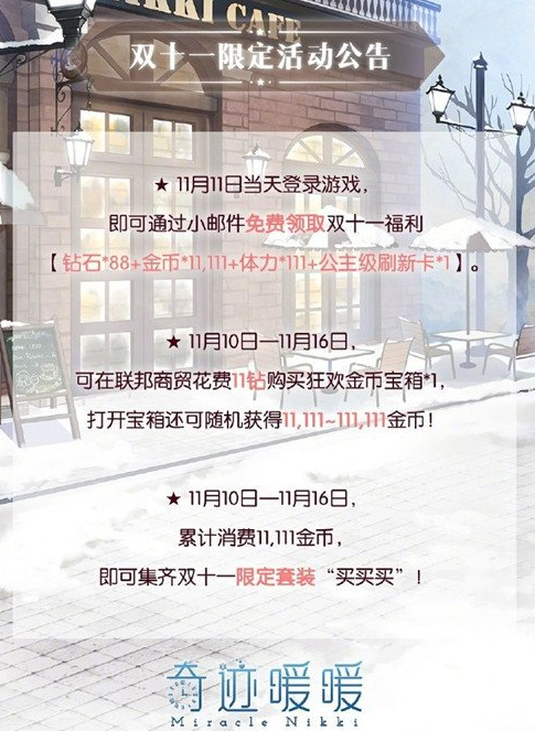 在11月11日当天登陆游戏,即可通过小邮件免费领取双十一福利(钻石*88+金币*11111+体力*111+公主级刷新卡*1)。