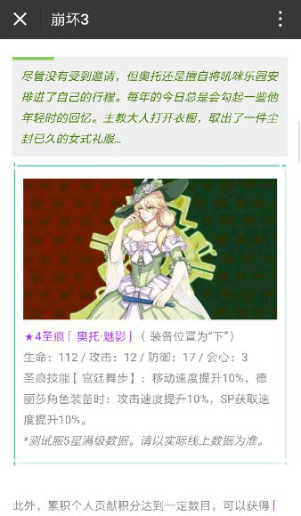 【宫廷舞步】:移动速度提升10%,德丽莎角色装备时:攻击速度提升10%,SP获取速度提升10%。
