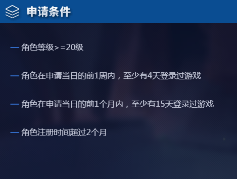 - 角色在申请当日的前1个月内,至少有15天登录过游戏