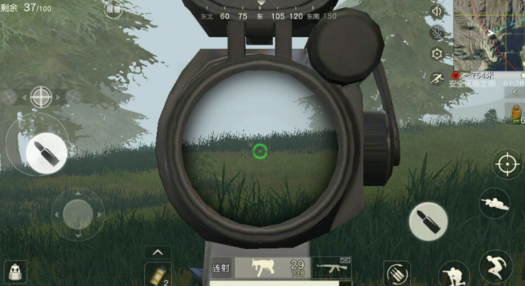 ④8倍瞄准镜,趴下一样会被身前的草挡住视觉,所以一般要蹲至高点,这样直觉才好一些,而开启之后,完全占领了边框移动位置,但是准心可以更好更清楚找到敌人,确定就是打完一枪,要是默默等待他的上弹自动开镜,就会镜头完全偏离了