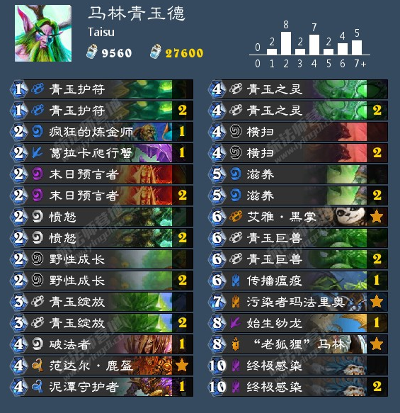 卡组简析:前期带了两个末日来过度,后期青玉德本身就很强势,同时又加上了马林+炼金的组合。