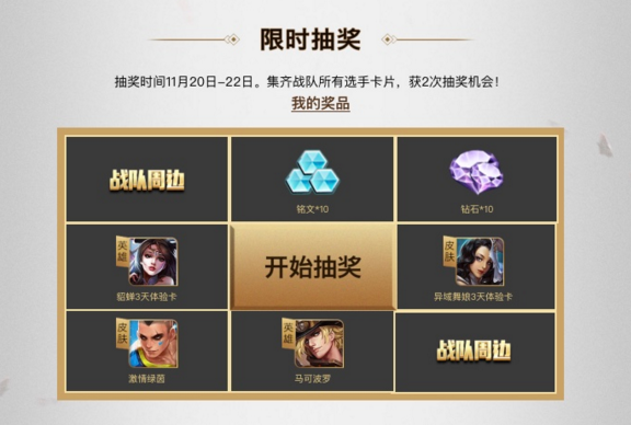 抽奖时间11月20日-22日,集齐所有选手卡片,获得2次抽奖机会。