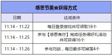 参与对战(不含人机)掉落感恩节美食,每日上限4个。感恩节美食用于兑换永久英雄、永久皮肤等感恩节好礼!