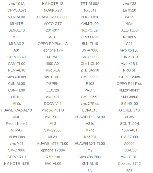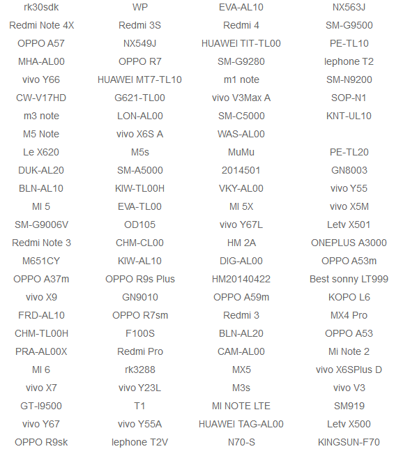 自《荒野行动》发布以来,项目组被广大吃鸡玩家的热情彻底震撼!正式开启不限号不删档测试前,日夜加班,以求最快速度解决机型适配问题,目前已完美优化300+手机型号,如下列表所示:(ps:非以下列表机型,也许在运行游戏上会有一些缺陷!)(再ps:想要快速查询自己的机型是否在下表中,可以按 Ctrl+F 快速搜索!)