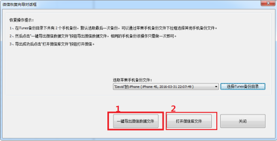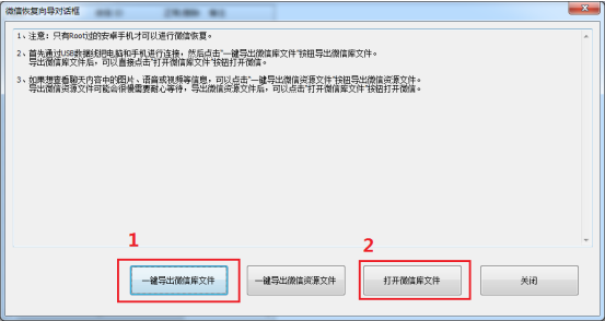 在“微信恢复向导”对话框中,首先通过USB数据线把电脑和手机进行连接,然后如下图点击“一键导出微信库文件”按钮导出微信库文件。然后点击“打开微信库文件”按钮,就可以打开需要恢复微信的聊天记录的浏览页面。