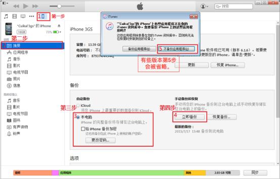 那么如何将保存微信聊天记录的文件全部导出到电脑上呢?这里我们需要使用苹果公司的iTunes管理工具备份苹果手机中的数据(可从苹果网站免费下载或百度“iTunes下载”获取)。下图是使用iTunes备份苹果手机数据的步骤。