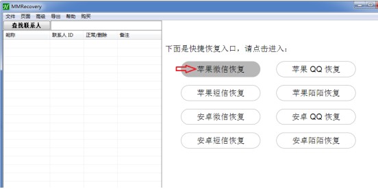 接下来就不需要手机了可以拔掉了,首先运行恢复工具MMRecovery,如下图在右侧快捷恢复入口,点击 “苹果微信恢复 ”按钮,将会弹出“微信恢复向导”对话框。
