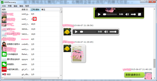 如下面的微信记录恢复效果图中双击左侧微信用户,右侧将会显示当前用户的聊天信息,图中红色方框中的“5”表示恢复出来的已被删除的聊天记录的数量。