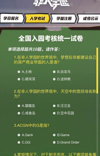 非人学园入学考试答题答案