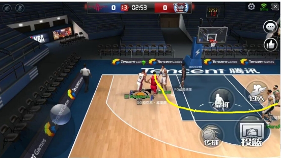 首先,外线球星在进攻时界面上有“过人”键,这个按键在做过人操作的时候非常关键,操作就是:在三分线外持球,然后运球的时候利用“过人”突破对手的防守,注意一定要朝无防守一方推方向摇杆,然后在达到第一张图的黄色区域内,上拉摇杆同时点击投篮,这时候就能实现带球过人上篮的酷炫操作了。