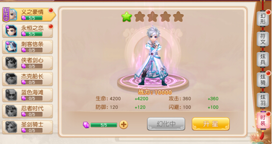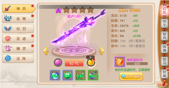 跟侍宠的幻形不同,幻形系统中的幻形决定的是角色自身的外观,神兵、坐骑、仙羽、足迹、精灵、法阵可以消耗对应的进阶丹提高阶级获得属性,每达到一个阶级即可解锁不同的外观,可以选择自己喜欢的外观自由幻化。