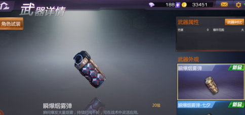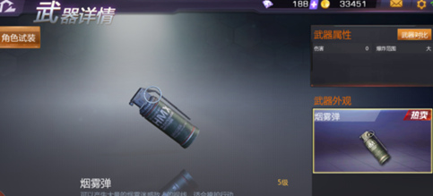 听它的名字就知道是烟雾弹的改版武器,瞬间爆开烟雾,但持续时间太短,不能很好的起到战术效果,不是很推荐购买。