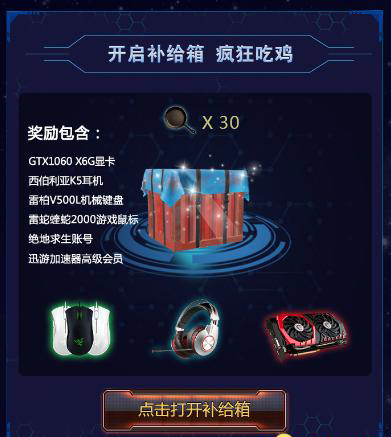 你问我箱子里有什么?迅游加速器高级VIP 1个月、《绝地求生》账号、雷蛇蝰蛇2000游戏鼠标、雷柏V500L机械键盘、西伯利亚K5耳机、微星MSI 1060 X6G显卡……100%中奖率,能够抽中哪一款,且看勇士你手气如何!