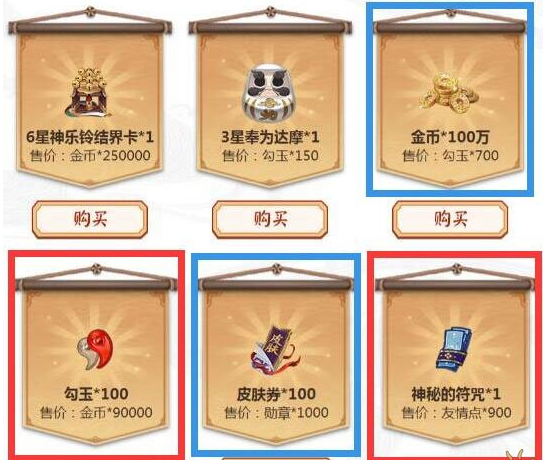 红色框的推荐换,勾玉的推荐理由是:逢魔遇到俩箱子钱就回来了,一个金币箱子50勾玉换8W