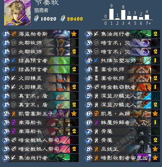 起手留北郡、盾、焦油。这个对局和打奥秘法很像,打到后期就是我们的胜利。船长不要轻易下,尽量能让焦油和宴会牧师立住吃伤害,之后的对局主要看谁的骨魇先buff上。如果能够2费王子,之后的高血量生物基本可以劝退猎人。站住场面之后,在中期如果有灭和窃歌者在手,基本宣告胜利。对手变了DK也无所谓,只要没有