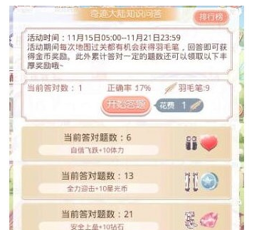 11月15日5:00—11月21日 23:59, 通关全地图任意关卡(联盟地图除外),即有机会获得羽毛笔。使用羽毛笔前往活动页面开启问答题,无论回答正确与否,皆可获得一定数量的金币奖励,答对题目达到指定次数,还有丰厚奖励等你哦~