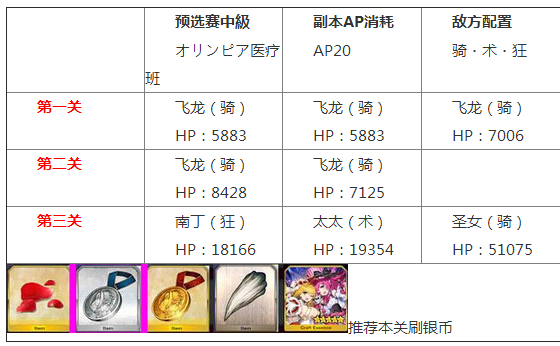 以上就是FGO尼禄祭再临预选赛中级的配置以及掉落一览了,预选赛中级有大量的骑阶飞龙和骑阶的圣女,所以建议用杀阶从者进行克制。