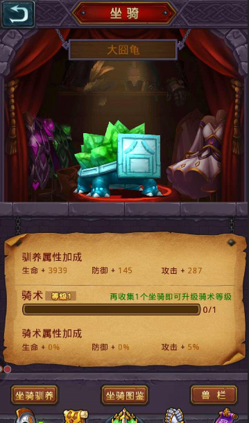 坐骑系统:坐骑种类很多,也很拉风,最主要提升玩家战力,开始的时候系统会赠送玩家一只大囧龟,等到30级的时候就可以培养坐骑了 。