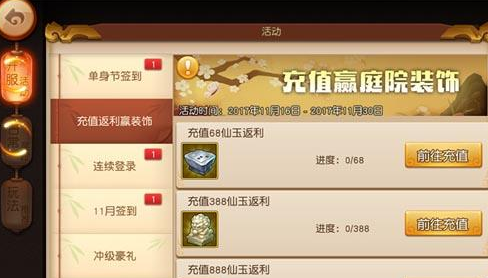 如此多精美的庭院装饰,除了在庭院中直接购买获得外,在2017年11月16日-11月30日期间,参与充值活动也可免费赢取全新庭院装饰!各位少侠充值仙玉达到68、388、888等不同数量均能获得不同的庭院装饰,改造庭院更轻松!