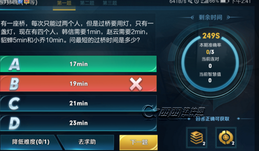 王者荣耀最短的过桥时间是多少,是王者知道脑力风暴题目之一,王者荣耀韩信,赵云,貂蝉,小乔过桥,询问4个英雄最多的过桥时间是多少,这是考验玩家计算能力的一道题目,那么王者荣耀最短的过桥时间是多少,西西带来王者知道脑力风暴答案,希望对大家有所帮助。