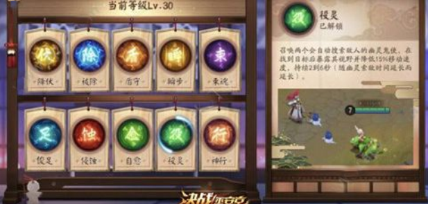 召唤两个会自动搜索敌人的幽灵鬼使,在找到目标后暴露其视野并降低15%移动速度,持续2到6秒(随幽灵索敌时间延长而延长)。