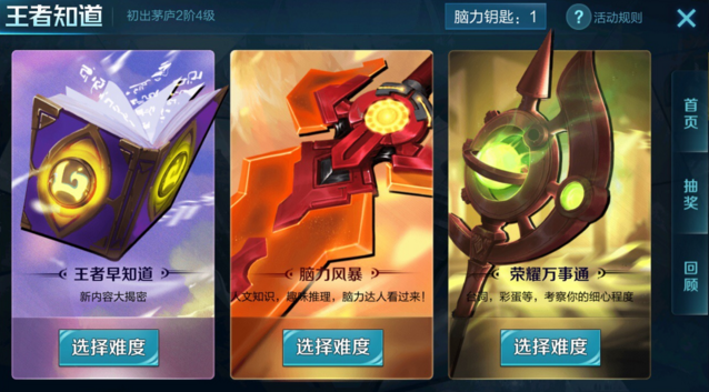 但要注意一下退出去的时间也会计算,如果玩家没有在规定时间选答案这个就直接错误了,最好先打开答题器网页或者手机电脑各开一个号,大号答题小号看答案,速度比较快。每个类型都有难度选择,每种难度都需要用钥匙打开。