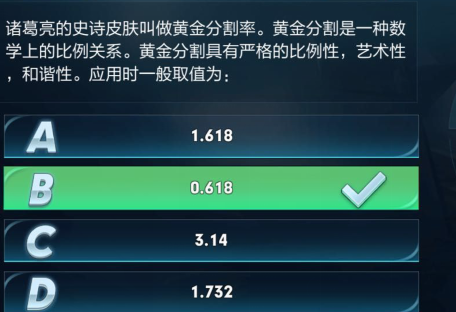 诸葛亮的黄金分割率应用时一般取值为多少 王者知道答案。王者荣耀王者知道中有一题与数学有关,诸葛亮的史诗级皮肤叫做黄金分割率,那么黄金分割率应用时一般取值为多少?一起来看看答案。