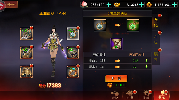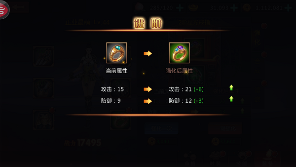 装备强化的最高等级限制为角色等级*2,所以当玩家的等级获得提升后,一定不要忘记来强化下装备哦。